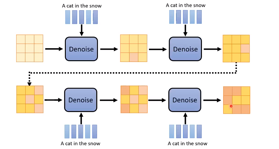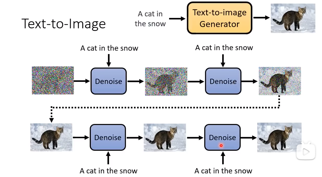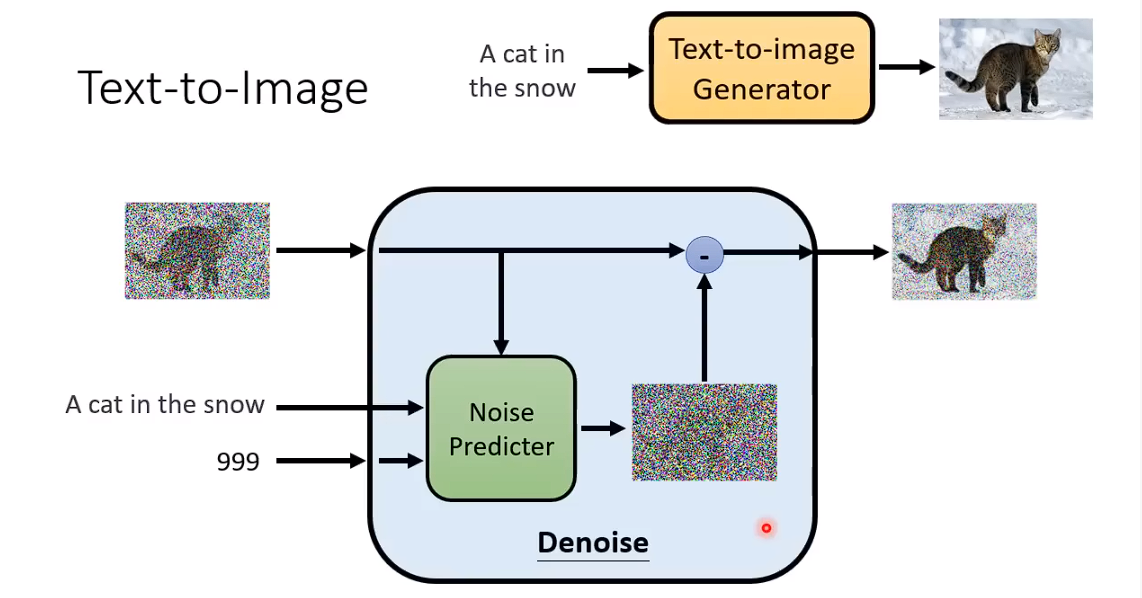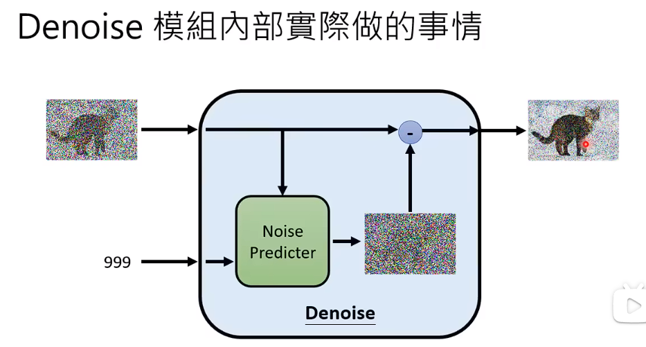 2、使用要还原的图片,减去预测出来的噪声,得到Denoise后的图片。Noise Predicter学习的是噪声。(学习这张图片中的噪声是比较简单的。直接端到端,学习加噪之后的猫,其实是非常困难的)