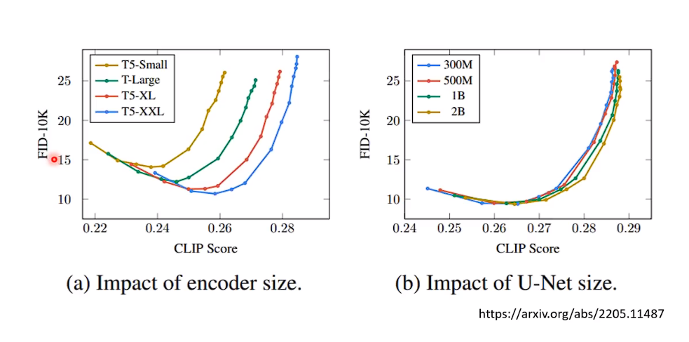 FID越小 生成的效果越好。CLIP Score 越大越好。总之 越往右下角越好。随着使用的Encoder越来越大,他生成的效果越来越好。