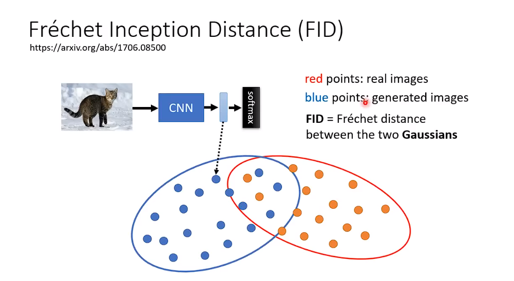 上面蓝色的点,代表生成的图片经过CNN model之后所产生的representation.红色的点,代表真实图片经过CNN model之后所产生的representation,