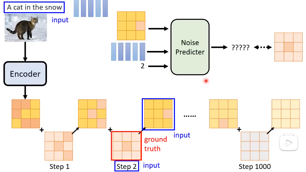 1、Denoise Preidcter除了吃要还原的图片,还要吃一个步骤的数字。 输出一张噪声的图片,即预测出在这张图片中噪声应该长成什么样子。