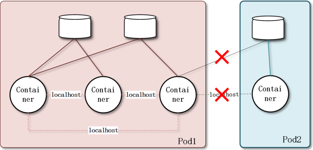 同样的,Pod 就是 K8S 中一个服务的闭包。这么说的好像还是有点玄乎,更加云里雾里了。简单来说,Pod 可以被理解成一群可以共享网络、存储和计算资源的容器化服务的集合。再打个形象的比喻,在同一个 Pod 里的几个 Docker 服务/程序,好像被部署在同一台机器上,可以通过 localhost 互相访问,并且可以共用 Pod 里的存储资源(这里是指 Docker 可以挂载 Pod 内的数据卷,数据卷的概念,后文会详细讲述,暂时理解为“需要手动 mount 的磁盘”)。笔者总结 Pod 如下图,可以看到:同一个 Pod 之间的 Container 可以通过 localhost 互相访问,并且可以挂载 Pod 内所有的数据卷;但是不同的 Pod 之间的 Container 不能用 localhost 访问,也不能挂载其他 Pod 的数据卷。