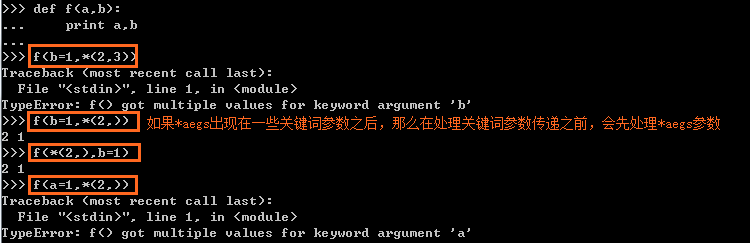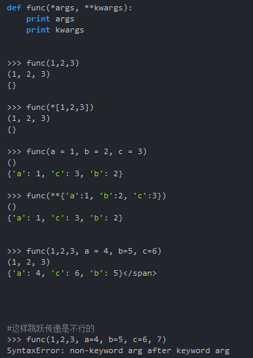 传入的顺序必须和定义顺序相同,这里是先不定参数列表,再是关键字参数字典,如: