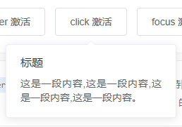 <el-popover placement="bottom" title="标题" width="200" trigger="click" content="这是一段内容,这是一段内容,这是一段内容,这是一段内容。"> <el-button slot="reference">click 激活</el-button> </el-popover>