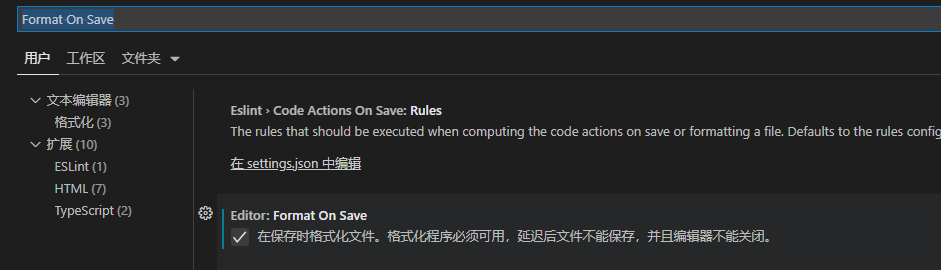 点击左上角的:文件=》首选项=》设置,搜索Format On Save,打上勾,这样保存的时候就可以格式化了
