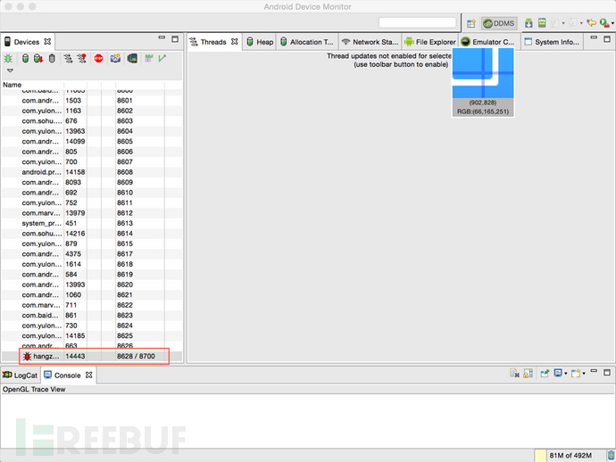8.从androiddevice monitor上发现需要调试的程序已经显示在列表里面了,记下端口号,本例中为8700;