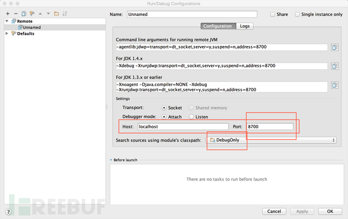 9. 新建远程调试:依次点击run->edit configuration->“+”号->Remote,选中第6步中新建的项目,填写第8步中获得的端口号,如图10;