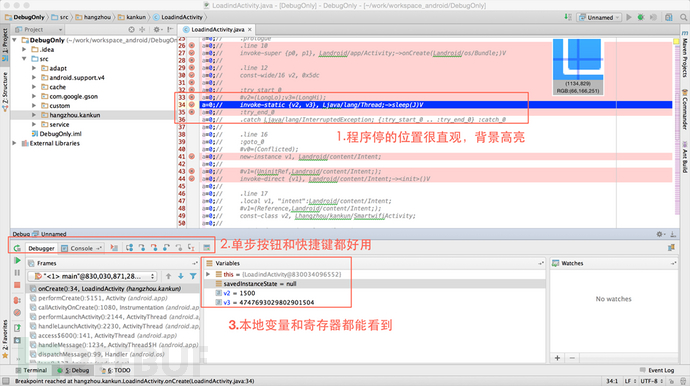 另外,阿呆曾经提到一篇文章用jdb远程调试android程序的文章,链接为:http://resources.infosecinstitute.com/android-hacking-security-part-6-exploiting-debuggable-android-applications/,我没有尝试过,主要是我比较懒,用apktool+idea已经够用了,就没去倒腾,有兴趣的小伙伴请自行倒腾,别忘了分享!