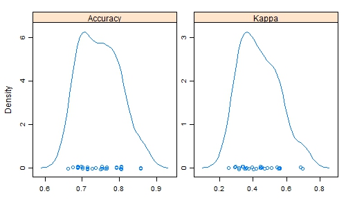 PimaIndiansDiabetes2是美国一个疾病研究机构所拥有的一个数据集,其中包括了9个变量,共有768个样本。响应变量即是对糖尿病的判断,它是一个二元变量。其它各解释变量是个体的若干特征,如年龄和其它医学指标,均为数值变量。其中有一些缺失值的存在,虽然朴素贝叶斯分类对于缺失值并不敏感,我们还是先将其进行插补,再进行建模以观察准确率。R语言中的e1071包中就有可以实施朴素贝叶斯分类的函数,但在本例我们使用klaR包中的NaiveBayes函数,因为该函数较之前者增加了两个功能,一个是可以输入先验概率,另一个是在正态分布基础上增加了核平滑密度函数。为了避免过度拟合,在训练时还要将数据分割进行多重检验,所以我们还使用了caret包的一些函数进行配合。