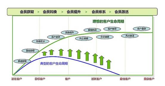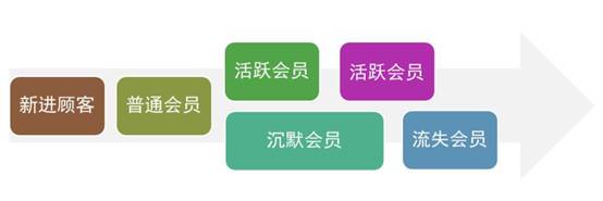 一个顾客来了之后,一部分会成为会员,这部分会员之后有可能会变成活跃会员,也有可能会流失,而活跃的会员有的会继续活跃,也有的会变成沉默会员,沉默的会员有可能会被再次激活,也有可能会流失掉,这就是从顾客进来到最后可能保持也可能流失的大概生命周期。