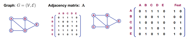 图的基本概念:主要有顶点和边构成,存在一个邻接矩阵A,如果对其中的nodes进行特征表示(Feat)的话如下右图。