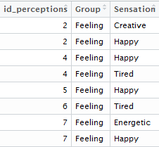 The second dataset contains information on the consumer perceptions. Consumers can indicate their perceptions of each drink on a number of different dimensions. In this post, I'll focus on the feelings induced by each beverage, characterized by sensations such as "happy" and "energetic." The dataset contains one line per perception, and has columns indicating the perception "Group" (here we're focusing on feelings, but other perceptions such as flavor are also present in the data), and the specific sensation within the feeling group (e.g. happy, energetic, etc.). This dataset can contain multiple lines per consumer review, if consumers indicated the presence of multiple characteristics for a given beverage. The id number in the perceptions data corresponds to the id number in the review data (though, as is often the case with real-world data, they do not share the same variable name). The head of the second dataset looks like this: