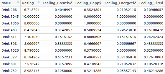 Our end goal, which I will discuss in my next post, is to use the ratings to perform a product segmentation, which will give us insight into how consumers perceive products within the beverage category. In order to reach that goal, we have to distill the information about the different beverages and the information from the consumer reviews into a single matrix that will allow us to derive these answers (with the right type of analysis).