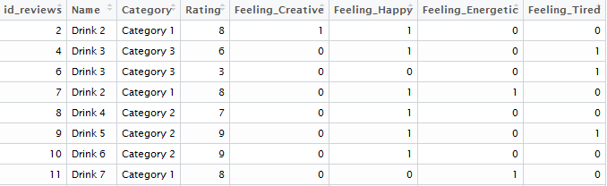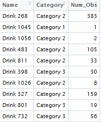 The first dataset contains basic information on the reviews. These data contain one line per consumer review, and have a column describing the review id number, the drink name, the drink category (there are three different categories of beverages in these data), and the overall rating score. Here's a sample of what the data look like: