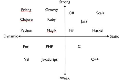 静态类型语言、动态类型语言、强类型定义语言、弱类型定义语言、编译型语言、解释型语言
