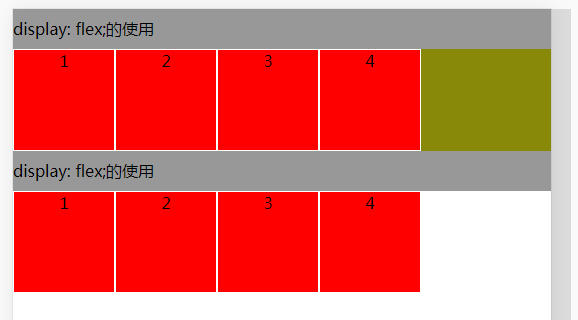<style type="text/css"> *{ margin: 0;padding: 0; } p{ height: 40px;line-height: 40px;background-color: #989899; } /*1.display:flex属性*/ .box-1{ display: flex; /*默认的沿主轴方向上来排列了,如没有这个属性,会以块级元素向下排列*/ /*由父元素撑开,具有block属性,也有flex属性*/ background-color: #888908; /*width: 100%;*/ } /*2.display:inline-flex属性*/ /*由里面的内容撑开,具有inline-block属性,也有flex属性*/ .box-2{ display: inline-flex; background-color: #888908; } .box{ width: 200px; height: 200px; background: red; border:1px solid white; text-align: center; } </style> <body> <p>display: flex;的使用</p> <div class="box-1"> <div class="box">1</div> <div class="box">2</div> <div class="box">3</div> <div class="box">4</div> </div> <p>display: inline-flex;的使用</p> <div class="box-2"> <div class="box">1</div> <div class="box">2</div> <div class="box">3</div> <div class="box">4</div> </div> </body>