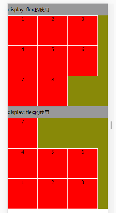 <style type="text/css"> *{ margin: 0;padding: 0; } p{ height: 40px;line-height: 40px;background-color: #989899; } /*1.display:flex属性*/ .box-1{ display: flex; background-color: #888908; flex-wrap: wrap; justify-content: center; /*里面的内容是居中的*/ } /*2.display:inline-flex属性*/ .box-2{ display: inline-flex; background-color: #888908; flex-wrap: wrap-reverse; justify-content: center; /*里面的内容是居中的*/ } .box{ width: 100px; height: 100px; background: red; border:1px solid white; text-align: center; } </style> <body> <p>display: flex;的使用</p> <div class="box-1"> <div class="box">1</div> <div class="box">2</div> <div class="box">3</div> <div class="box">4</div> <div class="box">5</div> <div class="box">6</div> <div class="box">7</div> <div class="box">8</div> </div> <p>display: flex;的使用</p> <div class="box-2"> <div class="box">1</div> <div class="box">2</div> <div class="box">3</div> <div class="box">4</div> <div class="box">5</div> <div class="box">6</div> <div class="box">7</div> </div> </body>