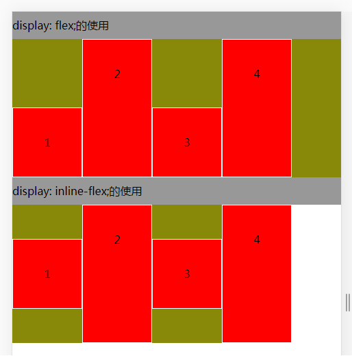 /*1.display:flex属性*/ .box-1{ display: flex; background-color: #888908; /*align-items: flex-start;*/ align-items: flex-end; } /*2.display:inline-flex属性*/ .box-2{ display: inline-flex; background-color: #888908; flex-wrap: wrap-reverse; align-items: center; } .box{ width: 100px; height: 100px; line-height: 100px; background: red; border:1px solid white; text-align: center; } <body> <p>display: flex;的使用</p> <div class="box-1"> <div class="box">1</div> <div class="box" style="height: 200px;">2</div> <div class="box">3</div> <div class="box" style="height: 200px;">4</div> </div> <p>display: inline-flex;的使用</p> <div class="box-2"> <div class="box">1</div> <div class="box" style="height: 200px;">2</div> <div class="box">3</div> <div class="box" style="height: 200px;">4</div> </div> </body>