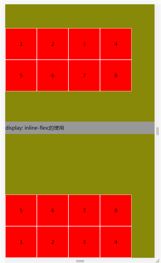 .box-1{ height: 400px; display: flex; background-color: #888908; /*align-items: flex-start;*/ flex-wrap: wrap; /*先设置换行*/ align-content: center; /*align-content:space-between;*/ } /*2.display:inline-flex属性*/ .box-2{ height: 400px; display: inline-flex; background-color: #888908; flex-wrap: wrap-reverse; /*反向换行*/ align-content: flex-start; } .box{ width: 100px; height: 100px; line-height: 100px; background: red; border:1px solid white; text-align: center; } <p>display: flex;的使用</p> <div class="box-1"> <div class="box">1</div> <div class="box">2</div> <div class="box">3</div> <div class="box">4</div> <div class="box">5</div> <div class="box">6</div> <div class="box">7</div> <div class="box">8</div> </div> <p>display: inline-flex;的使用</p> <div class="box-2"> <div class="box">1</div> <div class="box">2</div> <div class="box">3</div> <div class="box" >4</div> <div class="box">5</div> <div class="box">6</div> <div class="box">7</div> <div class="box">8</div> </div>