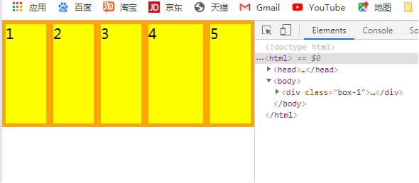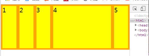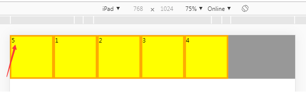 <style> *{ margin: 0; padding: 0; } .box-1{ background-color: #989898; display: flex; } .box{ box-sizing: border-box; width: 150px; height: 150px; background-color: yellow; border:5px solid orange; font-size: 20px; } .box5{ order:-1; //这样第5个就排在了前面 } </style> </head> <body> <div class="box-1"> <div class="box">1</div> <div class="box">2</div> <div class="box">3</div> <div class="box">4</div> <div class="box box5">5</div> </div>