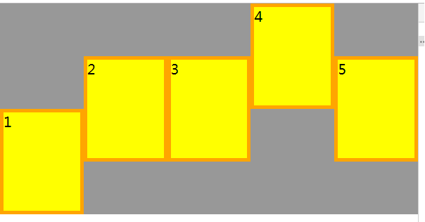 .box-1{ height: 300px; background-color: #989898; display: flex; align-items: center; /*父元素设置垂直居中*/ } .box{ box-sizing: border-box; width: 150px; height: 150px; background-color: yellow; border:5px solid orange; font-size: 20px; flex: 1; /*表示flex:1 1 0%;平分空间*/ } .box1{ align-self: flex-end; } .box4{ align-self: flex-start; } <div class="box-1"> <div class="box box1">1</div> <div class="box">2</div> <div class="box">3</div> <div class="box box4">4</div> <div class="box box5">5</div> </div>