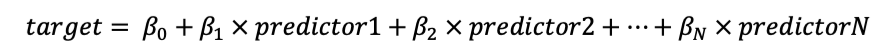 线性回归这个名字会告诉你所有你需要知道的事情--回归部分告诉你这个方法进行回归分析,线性部分告诉你这个方法假设属性之间存在线性关系。 为了找到属性之间的可能关系,线性回归假设并建立一个通用方程,将目标(因果属性)与预测因子(独立属性)联系起来。这个方程在这里被描绘出来。