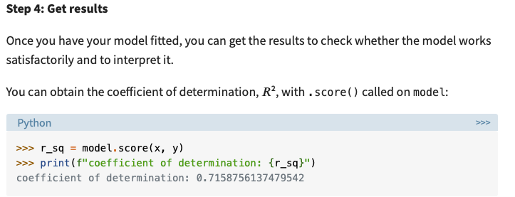 当你运行下面的代码时,几乎什么都没有发生,但是不要担心--模型已经完成了它的工作,我们只需要在下一步访问估计的βs。 4.如图所示,估计的βs是在训练好的lm模型内。我们可以用lm.intercept_来访问β0,lm.coef_将显示β1和β2。下面的代码会打印出一份有组织的报告,其中包括所有的β0实例。