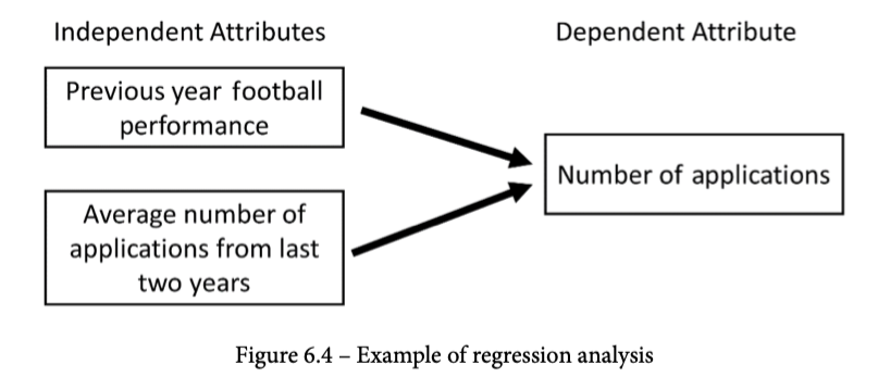 使用时间序列数据进行预测还有更复杂的方法,如加权MA,指数平滑,双指数平滑,等等。 我们在本书中不涉及这些方法,因为所有时间序列数据所需的数据预处理都是一样的。然而,你想从预测中记住的是,这些方法在单维时间序列数据上的预测工作。 例如,在MSU的例子中,我们唯一的数据维度是N_ Applications。 这种单一维度与我们将要介绍的下一个预测方法形成了鲜明的对比。回归分析,与预测相反,找到多个属性之间的关系来估计其中一个属性的数值。