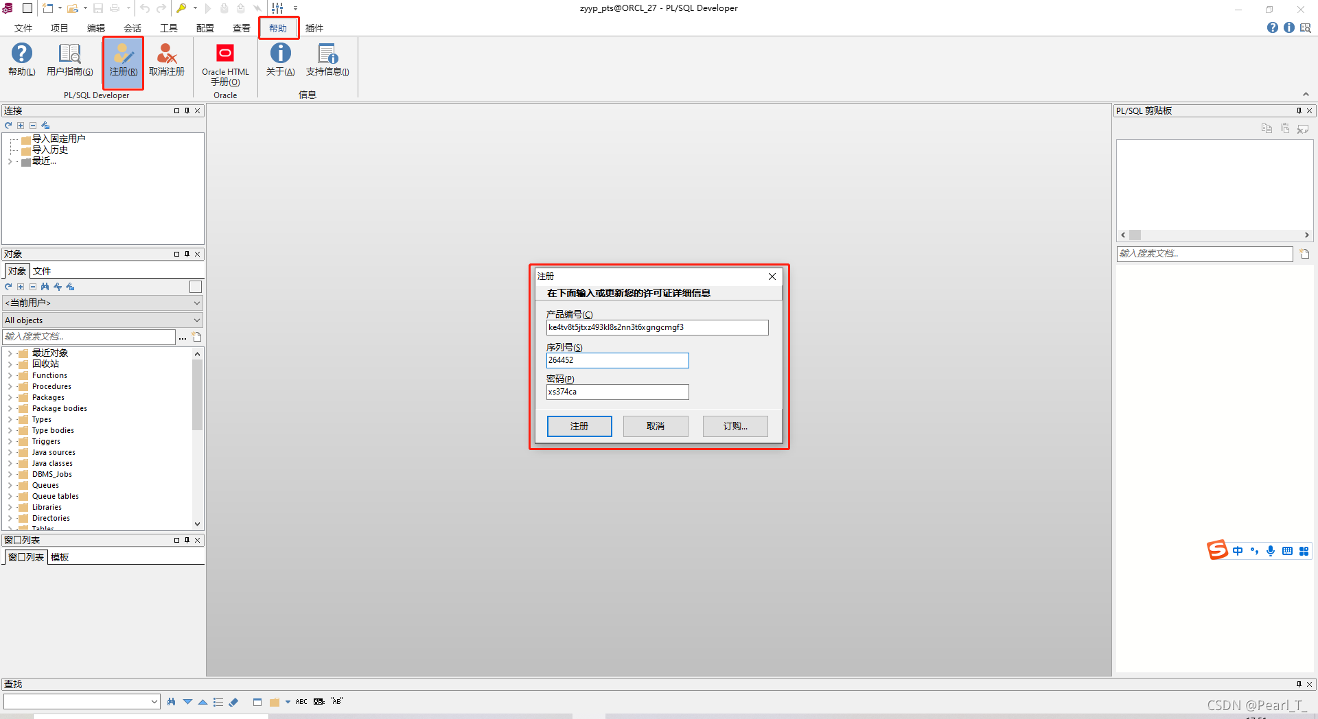 进入plsql,打开注册页面,输入注册码即可,注册码提供如下