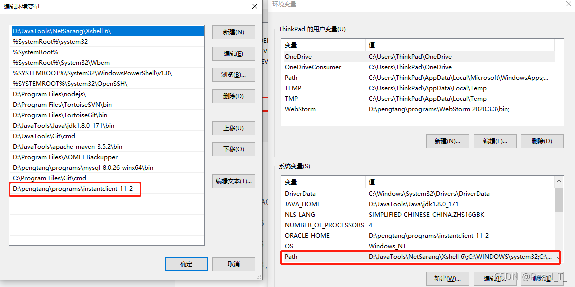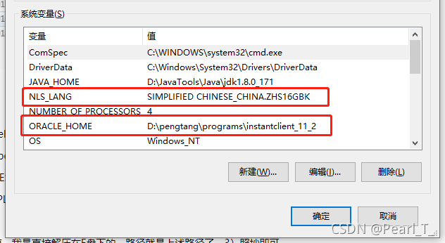 1) 变量名:ORACLE_HOME 变量值:D:\pengtang\programs\instantclient_11_2