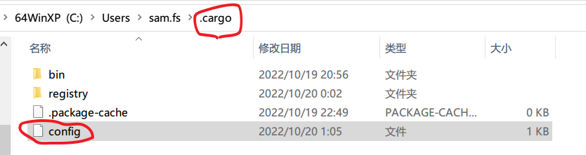 类似于python的pip,默认的cargo会从国外网站下载包,也可以修改为从科大下载。在用户主目录的.cargo目录下新建一个文件,命名为config(没有扩展名),并输入以下内容: