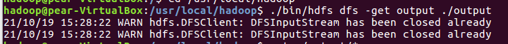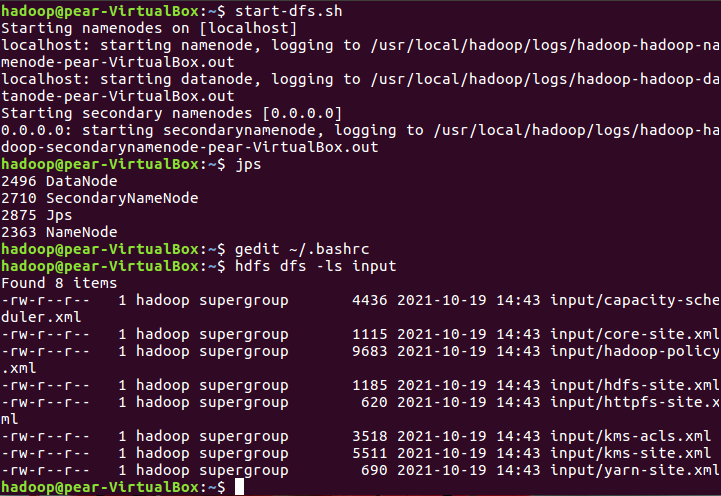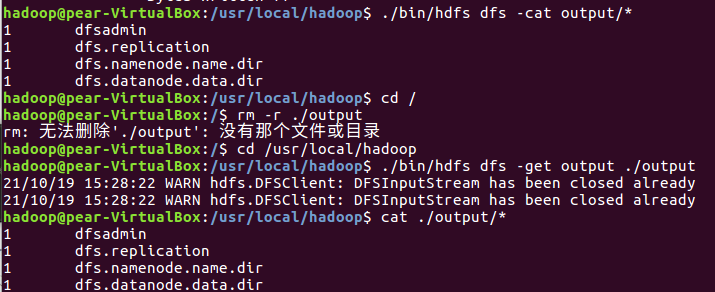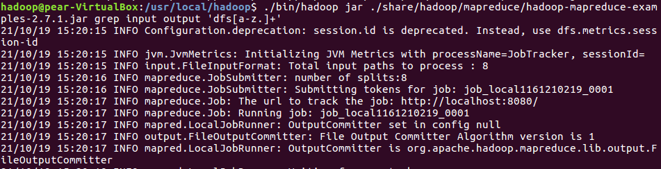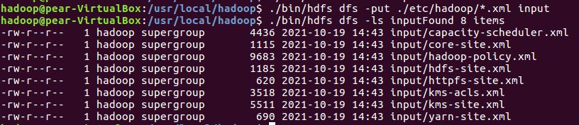 5.运行MapReduce示例作业,输出结果放在output目录下。