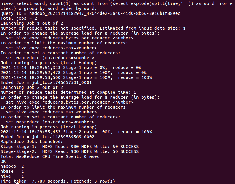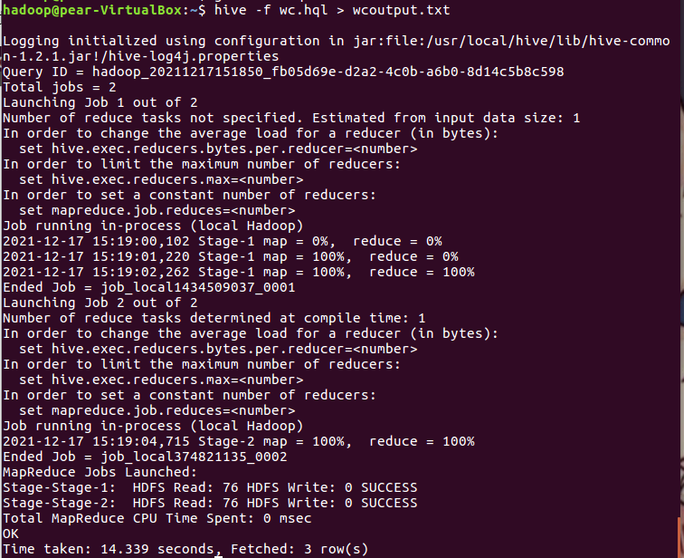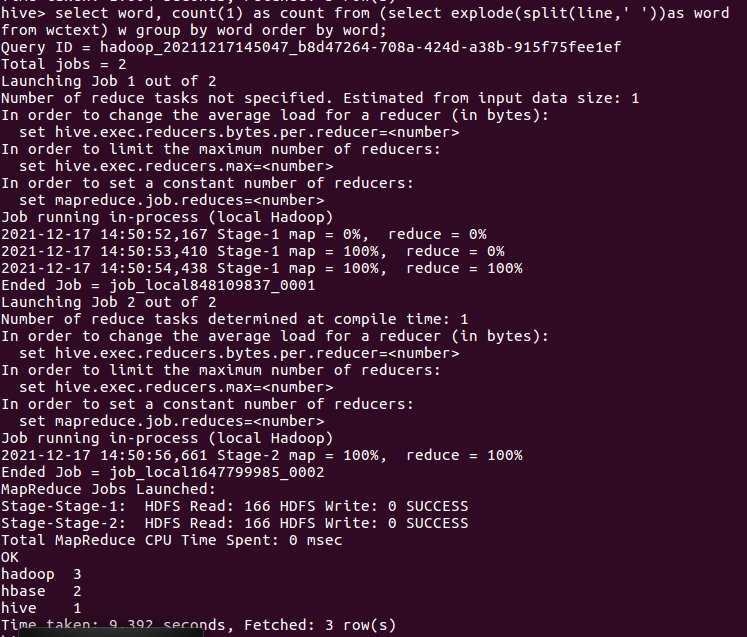 - 本地调用本地hql文件进行词频统计,将结果保存为本地文件