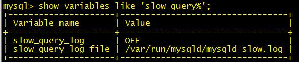 默认情况下slow_query_log的值为OFF,表示慢查询日志是禁用的,可以通过设置slow_query_log的值来开启,如下所示
