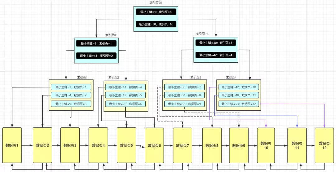 数据页之间是通过双向链表来维护的,索引页如果过多就会往上分裂(就像上面这张图),以此类推,这样就形成了由组件组成的 B+ 树结构,即【聚簇索引】