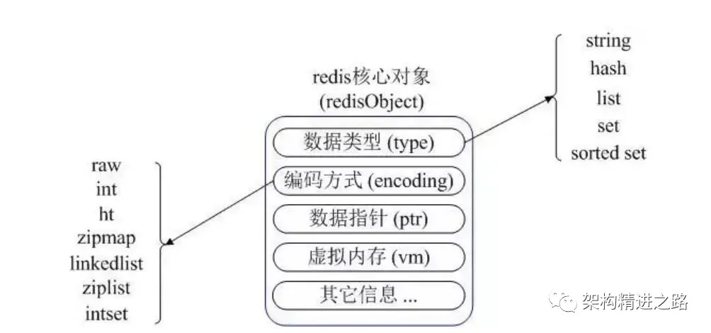 我: 首先redis 内部使用一个redisObject对象来表示所有的key和value,redisObject最主要的信息如上图所示:type表示一个value对象具体是何种数据类型,encoding是不同数据类型在redis内部的存储方式。比如:type=string表示value存储的是一个普通字符串,那么encoding可以是raw或者int。