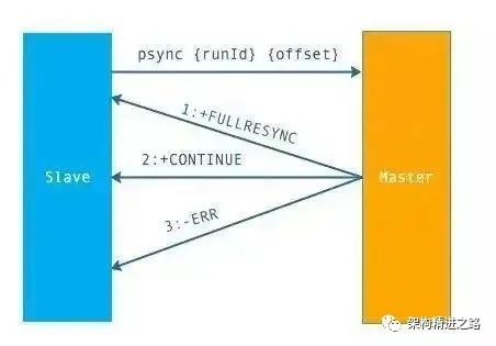 上面是psync的执行流程:从节点发送psync[runId][offset]命令,主节点有三种响应:(1)FULLRESYNC:第一次连接,进行全量复制 (2)CONTINUE:进行部分复制 (3)ERR:不支持psync命令,进行全量复制