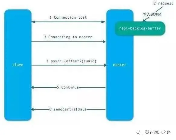 5、主节点根据偏移量把复制积压缓冲区里的数据发送给从节点,保证主从复制进入正常状态。
