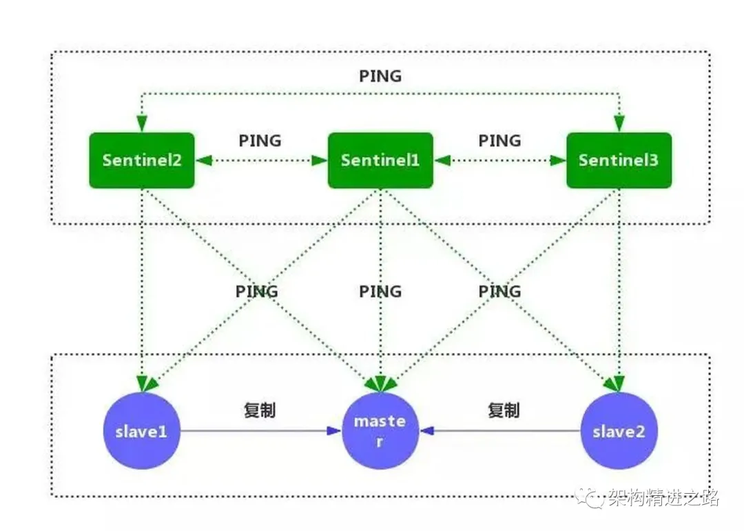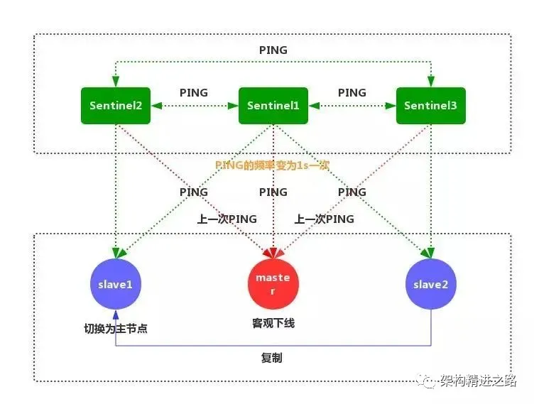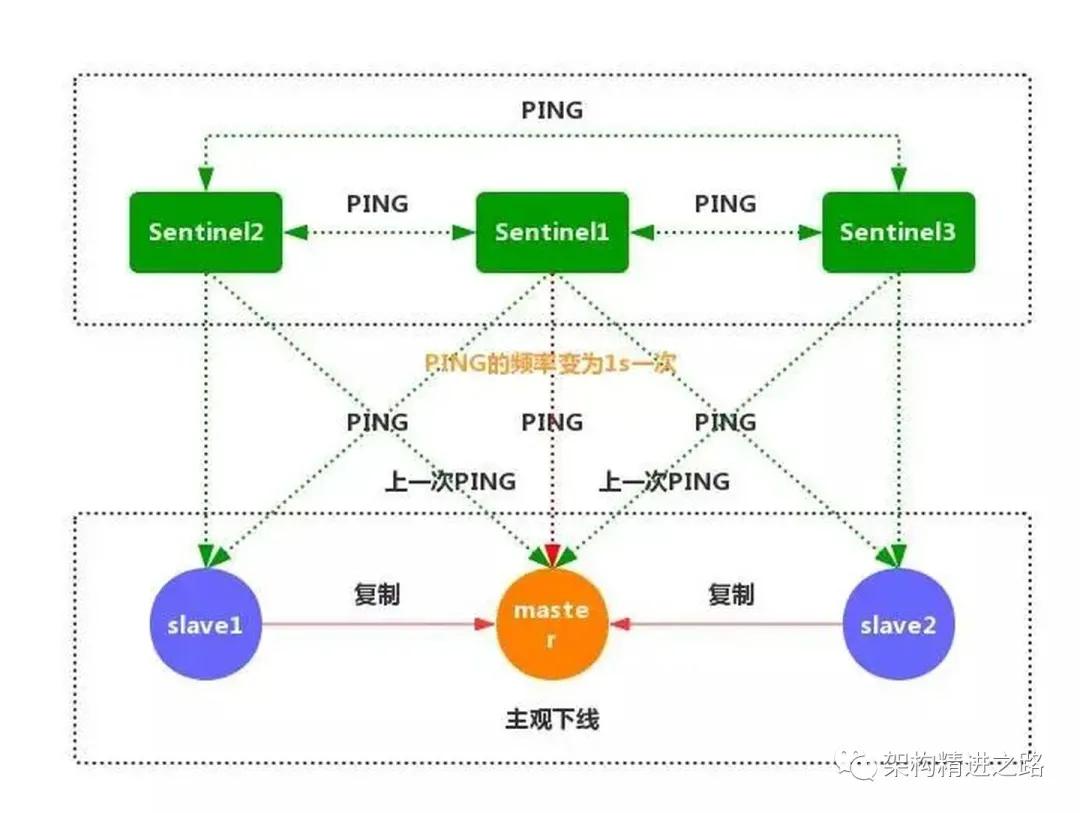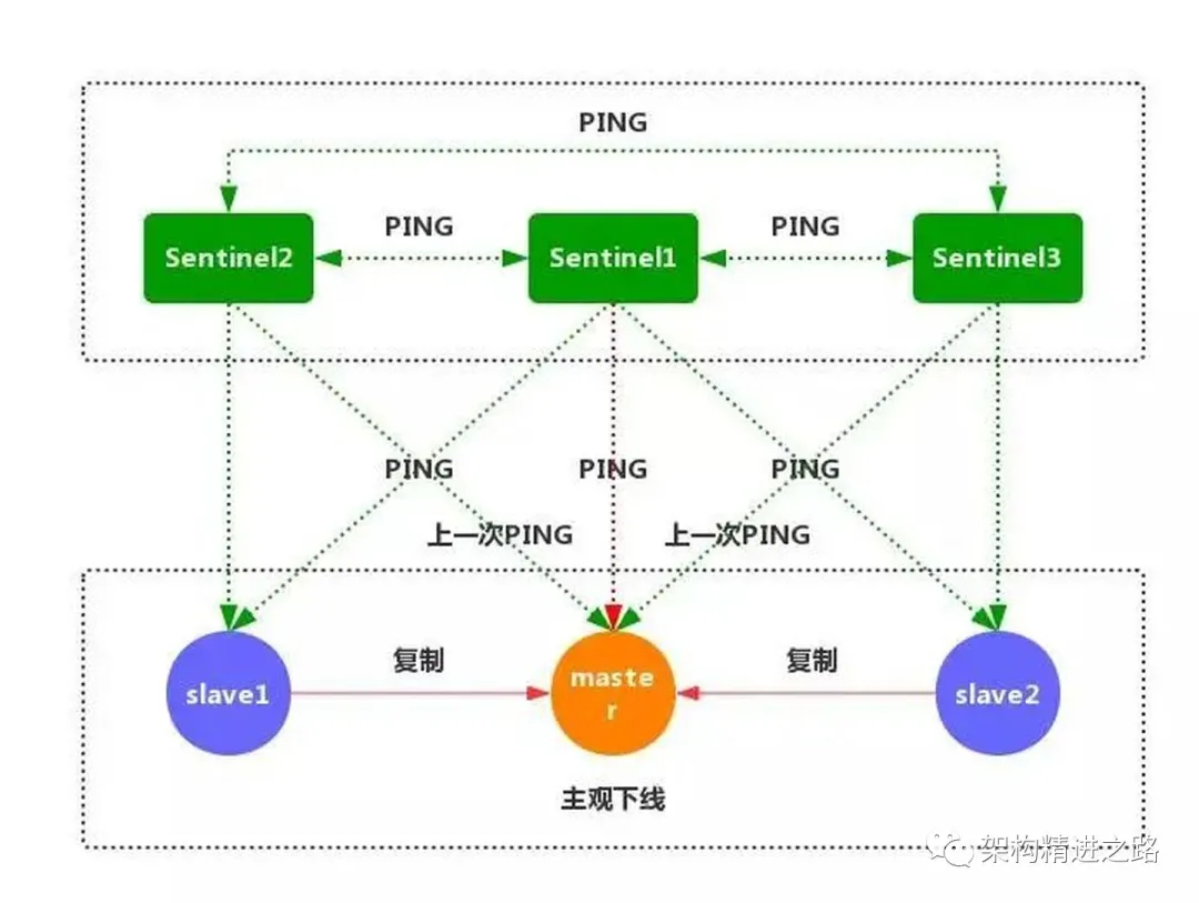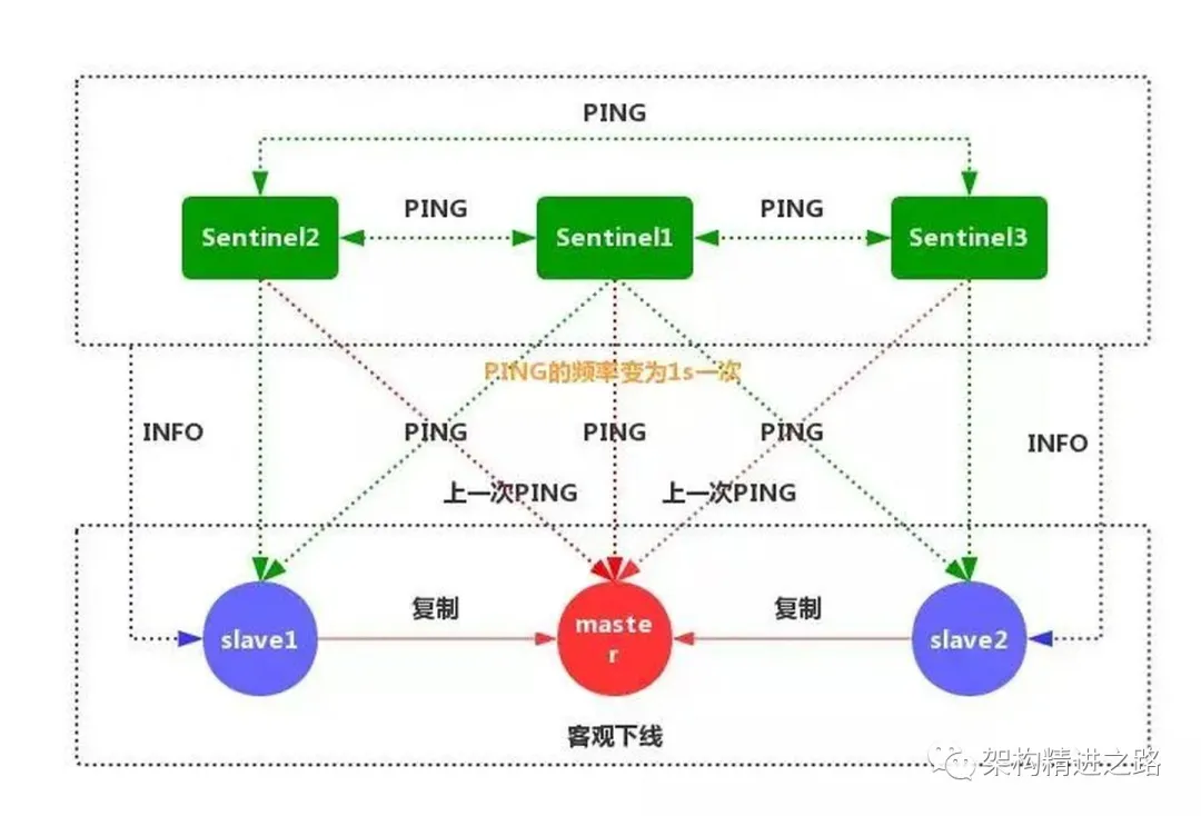 1、每个Sentinel节点都需要定期执行以下任务:每个Sentinel以每秒一次的频率,向它所知的主服务器、从服务器以及其他的Sentinel实例发送一个PING命令。(如上图)