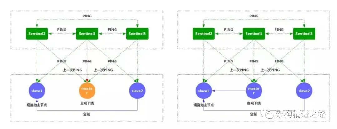 7、当没有足够数量的Sentinel同意主服务器下线时,主服务器的客观下线状态就会被移除。当主服务器重新向Sentinel的PING命令返回有效回复时,主服务器的主观下线状态就会被移除。