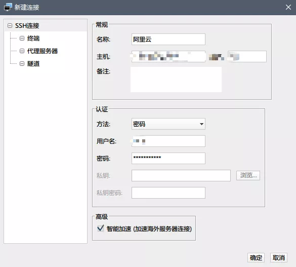 在弹出的窗口中输入你的用户名和密码,认证方式你也可以选择其他的方式,我这里是使用用户名和密码连接测试的阿里的一台linux服务器