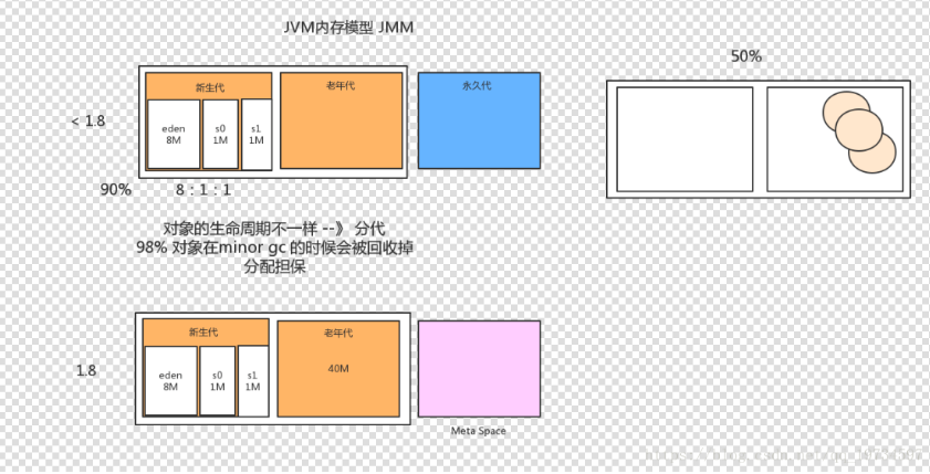 堆分为新生代和老年代。新生代分为:Eden 、from-survivor、 to-survivor ,GC首先会在新生代发生垃圾回收,如果未能回收,则会计数加1,直到加15,会将新生代中的数据,转移到老生代。