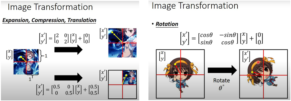 我们把图像中的每一个pixel坐标化,在其前面乘以一个变换矩阵,并加上一个平移向量,就可以得到这个pixel在新的图像中的位置坐标;