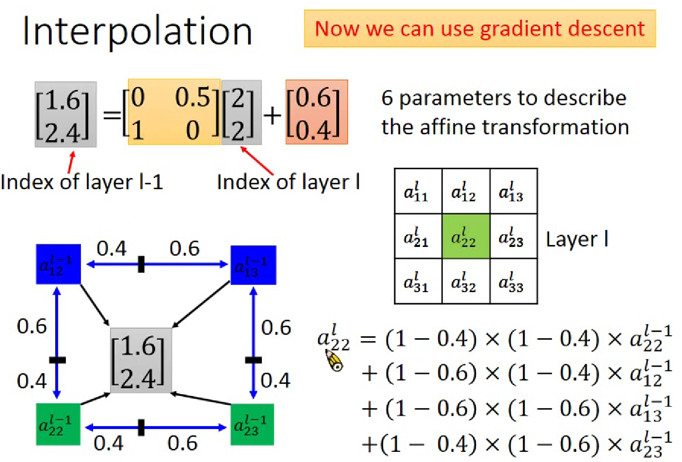 因为参数发生微小的变化时,[1.6, 2.4]如果变成了[1.61, 2.39],那么我们[原始图像]上[2, 2]坐标对应的pixel值也会跟着发生变化!