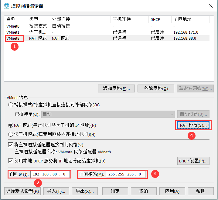 VMware -> 编辑 -> 虚拟网络编辑器 -> 按照下图顺序操作