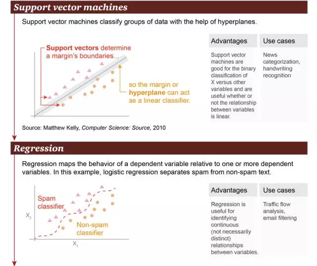 - 3. 回归(Regression):回归可以勾画出因变量与一个或多个因变量之间的状态关系。在这个例子中,将垃圾邮件和非垃圾邮件进行了区分。