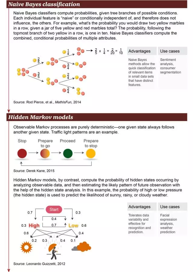 - 4. 朴素贝叶斯分类(Naive Bayes Classification):朴素贝叶斯分类器用于计算可能条件的分支概率。每个独立的特征都是「朴素」或条件独立的,因此它们不会影响别的对象。例如,在一个装有共 5 个黄色和红色小球的罐子里,连续拿到两个黄色小球的概率是多少?从图中最上方分支可见,前后抓取两个黄色小球的概率为 1/10。朴素贝叶斯分类器可以计算多个特征的联合条件概率。