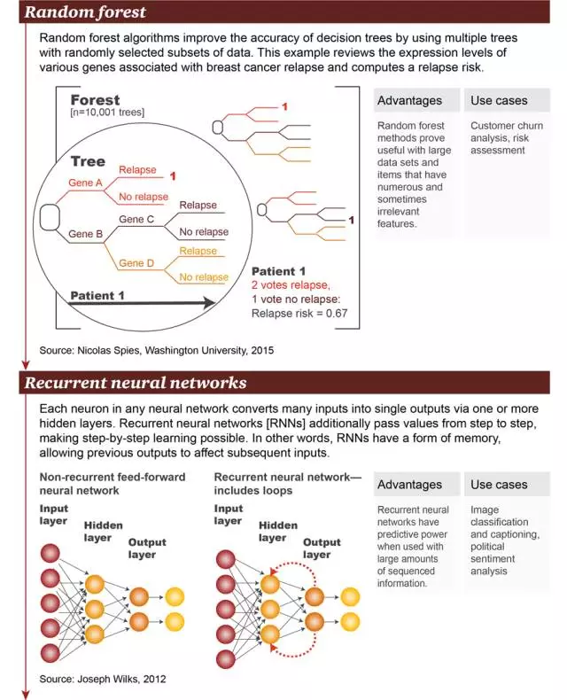 - 6. 随机森林(Random forest):随机森林算法通过使用多个带有随机选取的数据子集的树(tree)改善了决策树的精确性。本例在基因表达层面上考察了大量与乳腺癌复发相关的基因,并计算出复发风险。