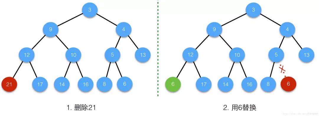 删除中间节点i,将值为11的节点复制过来,执行siftDown操作;