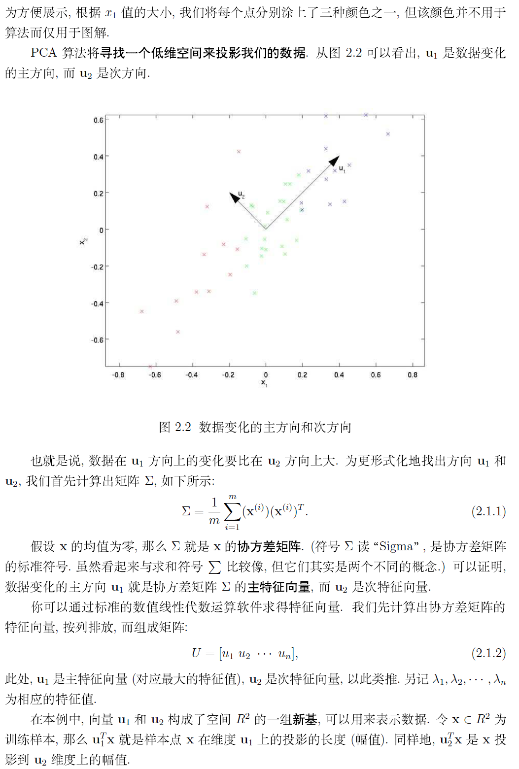 PCA 的推导中涉及较多的线性代数知识,如矩阵、特征值与特征向量、基表示、旋转等,此外还有一些概率统计方面的知识,如均值、方差、协方差等,为更好地理解文中 (2.1.1) 式关于协方差矩阵的理解,我在文章《关于协方差矩阵的理解》中给出了较详细的推导和说明,有需要的读者可参考。