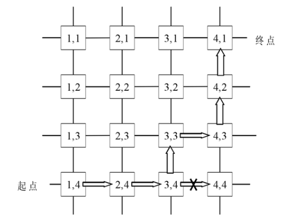 假设一个数据包路由的起点为(1,4),终点为(4,1)。如果按照一般的XY路由的话,它的路由路径应该是(1,4)一>(2,4)一>(3,4)一>(4,4)一>(4,3)一>(4,2)一>(4,1)。这时如果假设数据包在节点(3,4)发生了阻塞,不能继续向(4,4)发送。如果按照原来的XY路由,数据包就不能在往下发送,被阻塞在了(3,4)中。这时如果采用的是带有一定适应性的XY路由,在向节点(4,4)发送传送请求没有被允许之后,则它就会向Y维方向上的(3,3)节点发送传送请求,被允许之后,数据包就被发往节点(3,3)了。到达(3,3)后,又会先向X维方向上的(4,3)发送请求。就这样最终的路由路径为(1,4)一>(2,4)一>(3,4)一>(3,3)一>(4,3)一>(4,2)一>(4,1)。